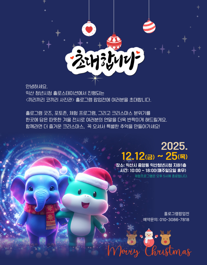 익산시에서 처음 선보이는 "크리스마스 홀로그램 팝업전"이 여러분을 찾아 옵니다. 최첨단 홀로그램 기술과 크리스마스의 따뜻함이 만나 모든 연령층이 함께 즐길 수 있는 특별한 공간을 만들었습니다. 가족, 친구, 연인과 함께 잊지 못할 겨울 추억을 만들어 보세요.