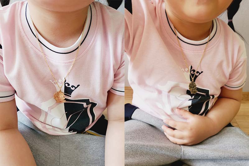[4세 아동 모델의 다정한 마룡 팬던트 목걸이 착용 사진]